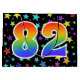 This exciting, fun, and vibrant gift bag design features numerous colourful star shapes, along with the number "82" featuring a multicolored rainbow inspired spectrum gradient pattern, on a black coloured background. A gift bag like this could perhaps be a fun way to wrap presents or gifts being given for somebody’s eighty second birthday, or perhaps for a couple’s eighty second wedding anniversary, or some other 82nd event. [~Z0000347]
