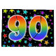 This exciting, fun, and vibrant gift bag design features a colourful pattern of star shapes, along with the number "90" featuring a multicolored rainbow spectrum like gradient pattern, on a black coloured background. A gift bag like this might be a fun way to wrap presents or gifts being given for somebody’s ninetieth birthday, or perhaps for a couple’s ninetieth wedding anniversary, or some other 90th event. [~Z0000347]