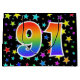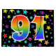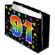This exciting, fun, and vibrant gift bag design features numerous colourful star shapes, along with the number "91" featuring a multicolored rainbow inspired spectrum gradient pattern, on a black coloured background. A gift bag like this might be a fun, happy way of wrapping gifts or presents being given for somebody’s ninety first birthday, or perhaps for a couple’s ninety first wedding anniversary, or some other 91st event. [~Z0000347]