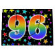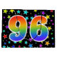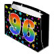 This exciting, fun, and vibrant gift bag design features many colourful star shapes, along with the number "96" featuring a multicolored rainbow inspired spectrum gradient pattern, on a black coloured background. A gift bag like this could perhaps be a fun way to wrap presents or gifts being given for somebody’s ninety sixth birthday, or perhaps for a couple’s ninety sixth wedding anniversary, or some other 96th event. [~Z0000347]