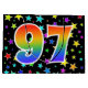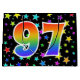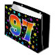 This exciting, fun, and vibrant gift bag design features a colourful star shapes pattern, along with the number "97" featuring a multicolored rainbow spectrum like gradient pattern, on a black coloured background. A gift bag like this could perhaps be a fun way to wrap presents or gifts being given for somebody’s ninety seventh birthday, or perhaps for a couple’s ninety seventh wedding anniversary, or some other 97th event. [~Z0000347]