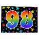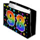 This exciting, fun, and vibrant gift bag design features numerous colourful star shapes, along with the number "98" featuring a multicolored rainbow inspired spectrum gradient pattern, on a black coloured background. A gift bag like this could perhaps be a fun way to wrap presents or gifts being given for somebody’s ninety eighth birthday, or perhaps for a couple’s ninety eighth wedding anniversary, or some other 98th event. [~Z0000347]