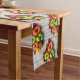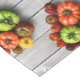 Add a touch of tasty apropos to the kitchen or dining experiences with this food-themed table runner, which features a repeating pattern of homegrown (and oddball) medley of striped, green, purple, and yellow tomatoes on a weathered grey picnic table. Pictured tomato cultivars include Green Zebra, Red Zebra, Indigo Rose, Brandywine, Black Prince, Midnight Snack cherry, and heirloom cherry.