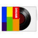 Half of a black vinyl record in a colourful cover of vertical large stripes written MUSIC