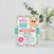 Fun, Cute owl, spring flower theme children's, girl's birthday party invite on bright colourful girly stripes pattern. Features patterned orange and yellow owl and pink and yellow flower on orange, lime green, teal, coral, white, and aqua turquoise stripes. One and 1st birthday can be personalised to other birthdays for toddlers, kids, or babies, baby.