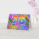 The front of this vibrant, exciting, and eye-catching birthday greeting card design features a colourful stripes pattern, along with the message "76 years old!" having a multicolored rainbow like gradient pattern. The inside features a customisable greeting message, or could perhaps be cleared and left blank if a message is to be written by hand instead. A greeting card like this might be used to send a message acknowledging somebody’s seventy sixth birthday. [~Z0000351]