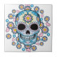 Sugar skull designed hues of blue and pink is surrounded by colourful flowers and hearts.