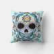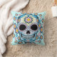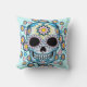 Sugar skull designed hues of blue and pink is surrounded by colourful flowers and hearts.