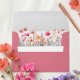 Complete your summer wedding stationery suite with a colourful boho wildflower envelope. Bright pastel flowers peek from under the envelope flap. providing the perfect simple, modern touch for couples mailing out floral themed wedding invitations. Perfect for cottage garden themes or romantic botanical aesthetics.