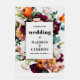 A beautiful wedding banner with a customisable wedding celebration design features fresh roses, ranunculus, dahlias, snapdragons, and begonias in burgundy, orange, white, and pink colours, displayed against a magenta background.