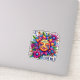 A radiant sun with a joyful expression sits at the centre, adorned with colourful tears, surrounded by a lush array of leaves and flowers in vibrant shades. The uplifting message invites all to embrace love and positivity amidst nature's beauty.