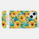 Customise this colourful modern sunflowers on teal painting iPhone 15 plus case with your your name in a trendy modern CAP font in teal on white. It's so beautiful and happy!