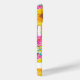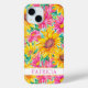 Customise this colourful modern yellow sunflowers with pink zinnias painting iPhone 15 case with your your name in a trendy modern CAP font in pink on white. It's so beautiful and happy!