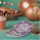 Graphical tiles in joyful colours, separated by black lines. It's general, but colourful, and can suit any occasion. The main area is covered with a semi transparent layer to make the part with food tidier, but you can remove this layer if you prefer full colour effect all over the plate. The semi transparent layer is good if you want to add text - it will make the text or logo stand out more.