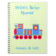 Sweet baby shower notebook done in a light green and white polka dot background, with adorable graphics of a colourful toy choo choo train. Blue text is fully customisable to suit your shower needs. Great for guests to write special notes to the mum to be and for listing the gifts received. Personalise for your baby shower.