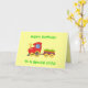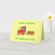 Colourful Toy Train Children's Happy Birthday Card. Buy as is, or Customise with your own wording on the front and inside by using CUSTOMIZE. Features a Cute Red Cartoon Engine with yellow wheels, pulling a colourful cart. Happy Birthday to A Special Child is written in green text on the front. Inside the greeting is Hope Your Day Is Extra Special. Keep or Personalise with your own message inside or add a name to the front.