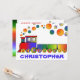 Fun, bright, multicolored choo choo train features red, blue, yellow, green, purple and orange gradients with smoke circles and striped wheels on white background. Perfect for your train themed birthday party! Customise name on front and event info on back.