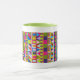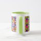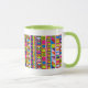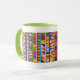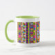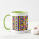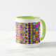 This mug has a patchwork composition with colourful various patterns. This product can be customised by adding text like a name or monogram