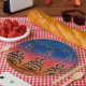 This beautiful deeply coloured design is of teepees and tribal stripes which have been artfully treated with an ombre background from cobalt blue through lavender and red to burnt orange tones. Designed by Lark Designs