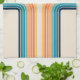 Retro style illustration with colourful (yellow, blue, orange, navy blue, beige, turquoise) arches decoration on beige background. You can add your name/monogram to personalise the item.