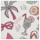 Graphic of red green yellow tropical beach summer vacation elements on white background, seamless repeat pattern