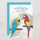 This design features a cute wild birds animal party, QR code social media online, with Facebook events rsvp information, a tropical beach pool outdoor party, a colourful jungle parrot wildlife cute, a simple minimalist minimal modern, a stylish trendy calligraphy script, a botanical palm tree leaves leaf, a tropical green greenery foliage, a whimsical cute fun party invitations