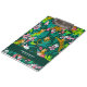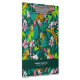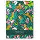 Colourful tropical jungle with flowers and cute animals in a seamless pattern on a dark green background.