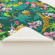 Colourful tropical jungle with flowers and cute animals in a seamless pattern on a dark green background.
