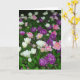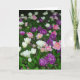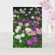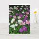 A card with a photo of tulips in white, pink and purple interspersed with other little flowers and leaves. The inside of the card has been left blank which can be further customised or left blank to write a personal message.