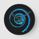 Wall clock with image an abstract image of a light blue twirl on black, on the face of the clock. Customisable.