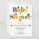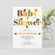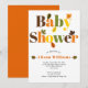 Colourful typography and leaves fall baby shower invitation. It displays the text "Baby Shower" in colourful typography, customisable text, acorans and leaves in brown, orange, olive green and yellow.