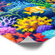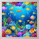 The image depicts a vibrant and lively coral reef teeming with colourful fish. The background is a bright blue, representing clear ocean water. Various species of fish, each sporting a unique pattern with bright colours like orange, yellow, blue, and pink, swim gracefully amidst the coral. The coral itself is a spectacle of colours, ranging from deep reds and oranges to vibrant purples and yellows. Bubbles rise towards the surface, adding to the dynamic and lively atmosphere of the underwater scene. The image evokes a sense of joy and wonder, capturing the beauty and diversity of marine life.