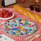 Colourful urban graffiti patchwork pattern paper plate featuring bold abstract blocks, expressive brush strokes, scribbles, stars, and mixed-media textures in bright blue, yellow, pink, orange, and black. Energetic and edgy with a modern street art aesthetic, this seamless design is ideal for graffiti art lovers, maximalist style fans, creative teens, and contemporary art enthusiasts.