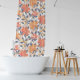 This colourful floral patterned shower curtain features a vibrant orange and yellow botanical print with blue leaves, and coordinates with the pretty floral decor including pillowcases, duvet cover, curtains and area rug found in this shop.