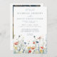 This design features a border of vibrant wildflowers in shades of red, yellow, green, teal, and blue. Perfect for casual summer weddings.