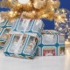 Festive and colourful collage of Victorian greeting card illustrations, each framed in ornate white frame, featuring six unique scenes of white-robed winged angels with decorative embellishments and Christmas greetings. Background is dark blue with tiny white stars. Seamless repeating pattern can be scaled up or down.