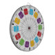 The design for this dartboard was inspired by a classic children's toy. This colourful illustration depicts a Viewmaster reel in bright colours: red, bright blue, sunny yellow, purple and bright green against a white background with black accents. The simple design has a retro modern look.