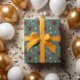 Christmas theme wrapping paper featuring colourful hand-drawn holiday symbols with red gold and forest green colours.