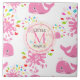 Cute pink whales pattern with colourful water splash oh girl with drops in different colours and a light pink transparent round badge with a name monogram.