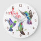 Three brightly coloured little hummingbirds surround pink fuschia flowers on this pretty clock. Colours used with pink are blue, purple, green, and brown. The brown numbers make the clock easy to read. Cheerful for a kitchen or any room!