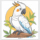 A vibrant cartoon-style cockatoo perched on a branch, featuring white plumage, blue wings, and a bold orange crest against a warm yellow circle. Bright, playful wildlife artwork suitable for branding and education.