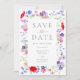 Unique hand painted colourful wildflower watercolor artwork a modern yet elegant wedding save the date invitation design to get your friends and family excited to save the date for your spring or summer wedding. Easy to personalise templates for details with modern Elegant typography script in slate grey and monogram initials of the bride and groom on the back of the invitation. Whimsical summer wildflowers include poppies, cornflowers, forget me knots, billy buttons and cosmos. Original artwork by artist catherine Sweetman using dusty blue, cornflower blue, pink, purple, lavender, plum, burgundy, yellow, peach, green and red hues to create beautiful meadow wildflower illustrations.