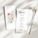 This refined wedding menu features delicate watercolor wildflowers arranged in a soft meadow style, creating a romantic and airy look for your reception tables. Perfect for rustic, garden, boho, and spring weddings. Customise menu items and text easily to match your event’s style.