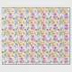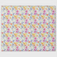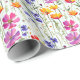 Wrapping paper in Brightly coloured wildflowers in various shapes and sizes scattered across a white background. The vibrant petals range from blues and green to red, orange and yellow