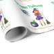 This colourful wrapping paper features a Halloween theme on white. A pretty witch with orange hair is standing next to her bubbling cauldron. A little spider is resting in her web above the witch. The Happy Halloween greeting is placed above the illustration and a sample family name is printed below. You can personalise the wrapping paper to include your own custom name or text.