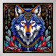 Strikingly stylised wolf's head, chraacterised by intricate patterns and vibrant colours. The wolf's fur is predominantly a mix of blue and white, with bright orange accents highlighting the face and ears.