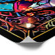 Around its neck, there is a decorative chain that adds an ornate touch. The background is embellished with various colourful shapes, including crystals and leaves, which enhance the overall mystical and artistic feel of the piece. Additionally, decorative elements such as beads and ornaments dangle from the sides, contributing to a bohemian atmosphere.