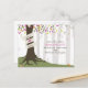 A wedding save the date postcard featuring an illustration of a tree in the forest. Tree has orange, pink, purple, yellow, and green leaves, exposed roots, and a trunk wrapped with banner that can be customised with bride & groom's names.