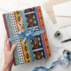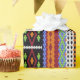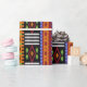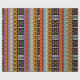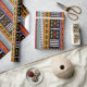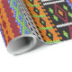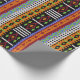 Colourful, traditional fabric design in black, red, orange, blue, white, and green, printed on wrapping paper. May be reminiscent of some African fabric or beadwork designs, though this was not the original intention with the design. This was made using Affinity Designer.