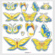 There are 14 total vinyl stickers in this set which are large enough to be used on all sorts of surfaces including laptops, car windows, mirrors, water bottes and even skateboards. Several different varieties of butterflies, all with basic colours of yellow and blue